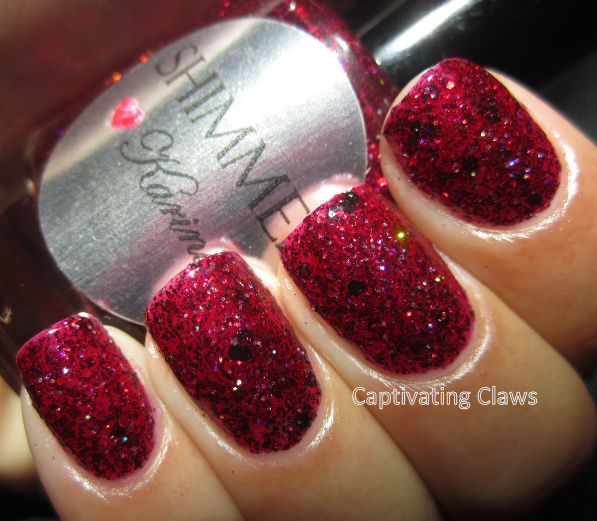 Karina is different from the others because she has a deep cranberry base instead of a clear base. Karina has black, silver, wine and scattered holo glitters. Pictured above is two coats of Karina, followed by a coat of gelous, then a fast-dry topcoat. Another beauty!!