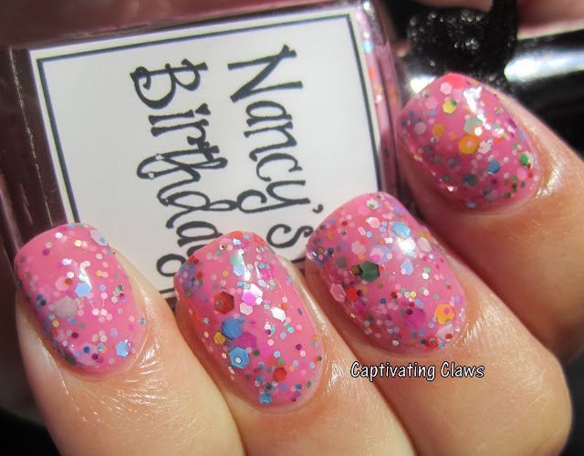Nancy's Birthday is so much fun!! I love the shade of pink of the base. It's a bubble-gum pink jelly packed full of various sizes and colors of hex glitter. I have two coats followed by topcoat in the above two pictures. Nancy's Birthday kinda reminds me of Deborah Lippmann's Candy Shop.